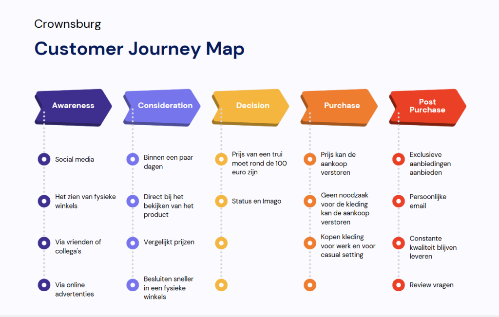 Voor Crownsburg was het heel belangrijk om inkijk te krijgen over de doelgroep. Daarbij heb ik een enquete gemaakt met verschillende vragen over hoe en waarom ze kleding kopen. Na dat ik de enquete uit uitgestuurd heb ik het in een customer Journey gezet. Uit de enquete hebben we besloten dat de doelgroep lager moet worden, vooral bij de antwoorden die ik kreeg bij de sociale media gebruik.